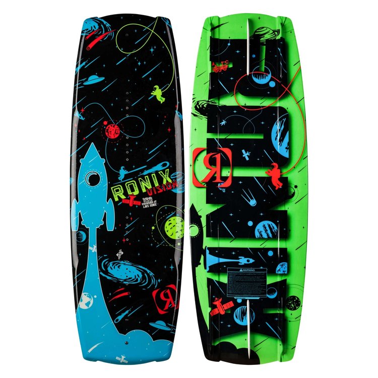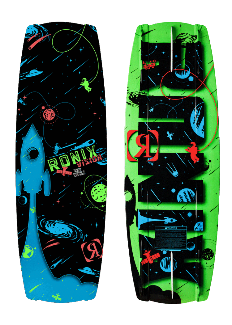 Designed and created by the boy’s modern prospect, recognizing that wakeboarding is the only board sport where your hips and shoulders aren’t parallel. A symmetrical shape with asymmetric features designed solely for the needs of the next generation of rippers. Your body is in an unbalanced position edging into the wake toeside so we created a thinner, sharper rail to help set an easier, more confident edge. Then on your heelside your body is more comfortable in an aligned position so we added a fuller vertical rail to generate more top water speed over the water. Come into the wake flat without much edge hold? No worries, we have more volume in the ends to help generate natural lift off the wake. Our Grom Glass offers a lighter layup for more feel with the water, and less swing weight in the air. A rockerline designed to assist a rider in a relaxed, neutrally balanced position. Flip the lights off, and check out the glow in the dark images of the Vision.