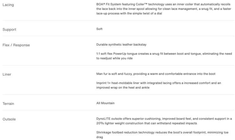 LINER: Man fur is soft and fuzzy, providing a warm and comfortable entrance into the boot, Imprint 1+ heat-moldable liner with integrated lacing offers a increased comfort and an improved wrap on the heel and ankle