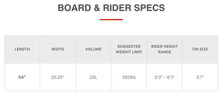 | LENGTH | WIDTH | VOLUME | SUGGESTED WEIGHT LIMIT | RIDER HEIGHT RANGE | FIN SIZE |
