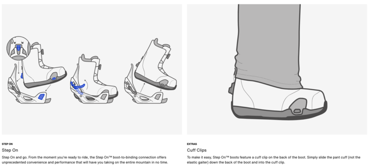The Step On® system creates a clean and simple boot-to-binding interface that lets you step right in. No buckles. No Straps. No Fuss.