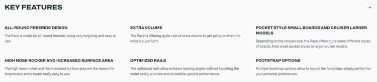 It comes with a four way track mount, easy and fast to connect to the mast. Its all-round freeride shape is quite forgiving and offering some extra volume for when needed to get going and when the wind is superlight. The high nose rocker and the big surface area avoid unnecessary nose dives and add to the easiness of use of the Pace. The Pace range is very versatile, offering smaller pocket style boards and also larger cruiser models, making it easy to find the right size for your preferred riding style and rider level. Flying upwind is of course one of the prime disciplines of the Pace, with optimized rails making incredible leaning angles possible. Multiple footstrap options are making it easy to find exactly the right positioning for your personal preferences. Built to stand the test of time this precision molding Pace construction is a guarantee for easiness of use, plenty of control and speed!