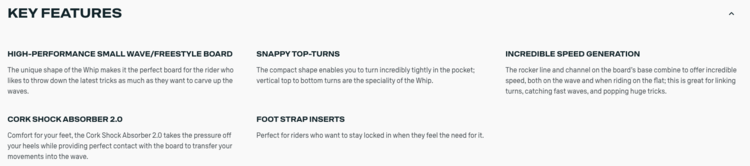 The Whip is a small to medium wave and strapless freestyle machine. Generous nose rocker, high-performance rails and a "wide bump-squash" tail design make the Whip quick and agile when transitioning rail to rail, very reactive and able to operate in a tight transition in small waves for radical turns. The Whip's compact shape is the ideal board for strapless freestyle, strapped airs and seasoned surfers. In addition, the Classic Vacuum Bamboo Tec Construction is incredibly durable while offering good flex for a lively feel on the water. The Whip is an extremely well-balanced board with incredible handling but still provides explosive snap off the top with the ability to turn in a very tight radius on steep sections. If you want a board that is at home in the air as it is on the wave face, this is it.