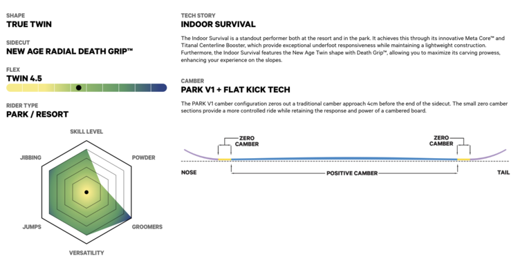 The Indoor Survival is a standout performer both at the resort and in the park. It achieves this through its innovative Meta Core™ and Titanal Centerline Booster, which provide exceptional underfoot responsiveness while maintaining a lightweight construction. Furthermore, the Indoor Survival features the New Age Twin shape with Death Grip™, allowing you to maximize its carving prowess, enhancing your experience on the slopes.