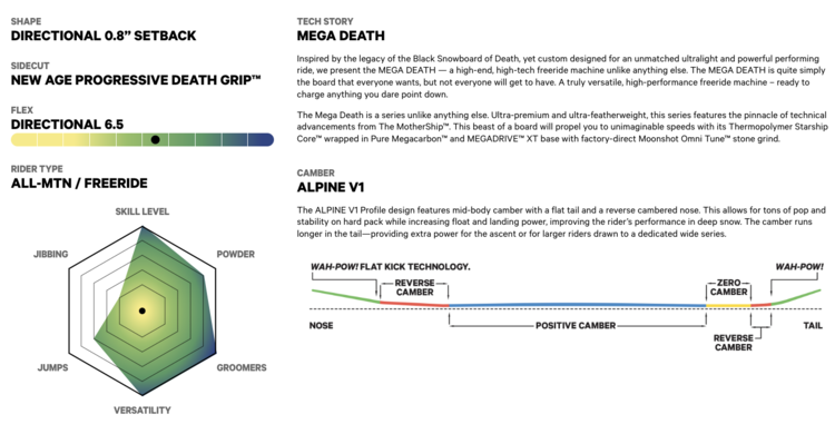 Inspired by the legacy of the Black Snowboard of Death, yet custom designed for an unmatched ultralight and powerful performing ride, we present the MEGA DEATH — a high-end, high-tech freeride machine unlike anything else. The MEGA DEATH is quite simply the board that everyone wants, but not everyone will get to have. A truly versatile, high-performance freeride machine – ready to charge anything you dare point down.