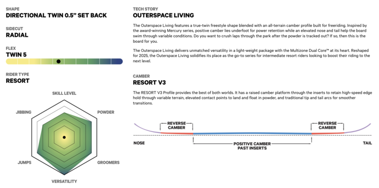 The Outerspace Living delivers unmatched versatility in a light-weight package with the Multizone Dual Core™ at its heart. Reshaped for 2025, the Outerspace Living solidifies its place as the go-to series for intermediate resort riders looking to boost their riding to the next level.