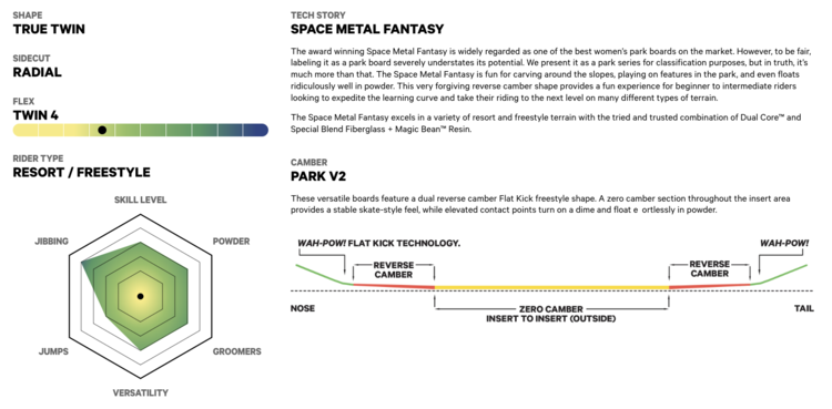 The award winning Space Metal Fantasy is widely regarded as one of the best women’s park boards on the market. However, to be fair, labeling it as a park board severely understates its potential. We present it as a park series for classification purposes, but in truth, it’s much more than that. The Space Metal Fantasy is fun for carving around the slopes, playing on features in the park, and even floats ridiculously well in powder. This very forgiving reverse camber shape provides a fun experience for beginner to intermediate riders looking to expedite the learning curve and take their riding to the next level on many different types of terrain.
