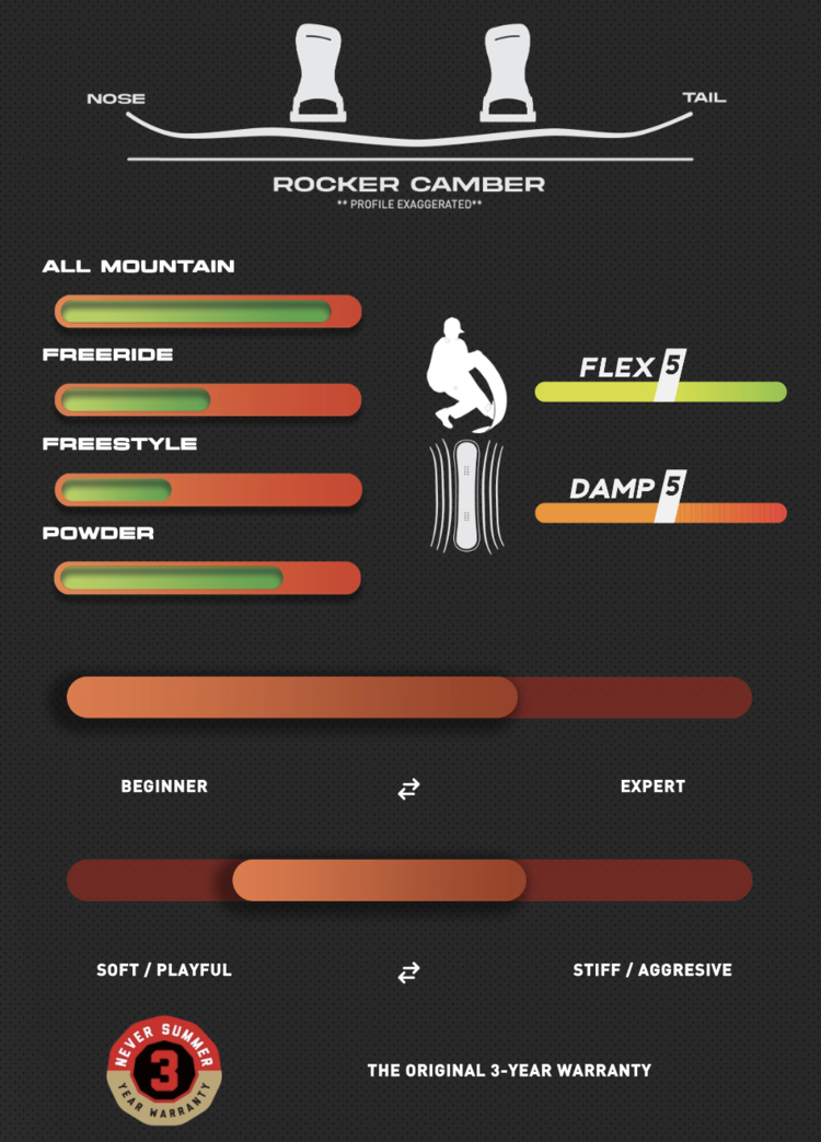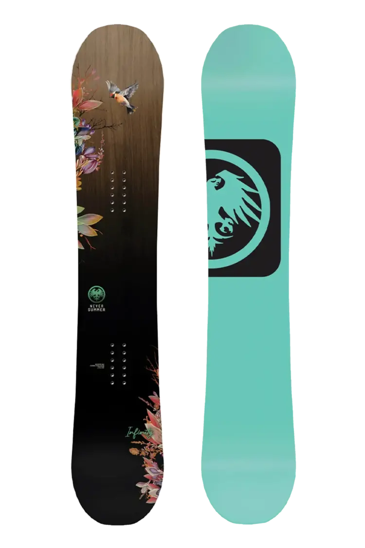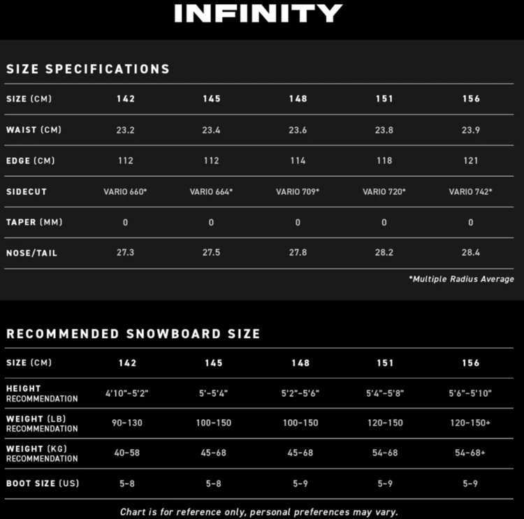 Proven worldwide by riders of all levels and the first choice for one of the fastest rising female snowboarders in the game, Iris Pham, the award winning, mid-flex, time tested Infinity is perfect for any condition. Carbon VXR Laminate Technology provides power and an agile response to the ends of the board while maintaining torsional control. A slightly set back stance and Rocker Camber Profile create an all-terrain deck that excels on hard pack, powder, and park — versatility at its finest.