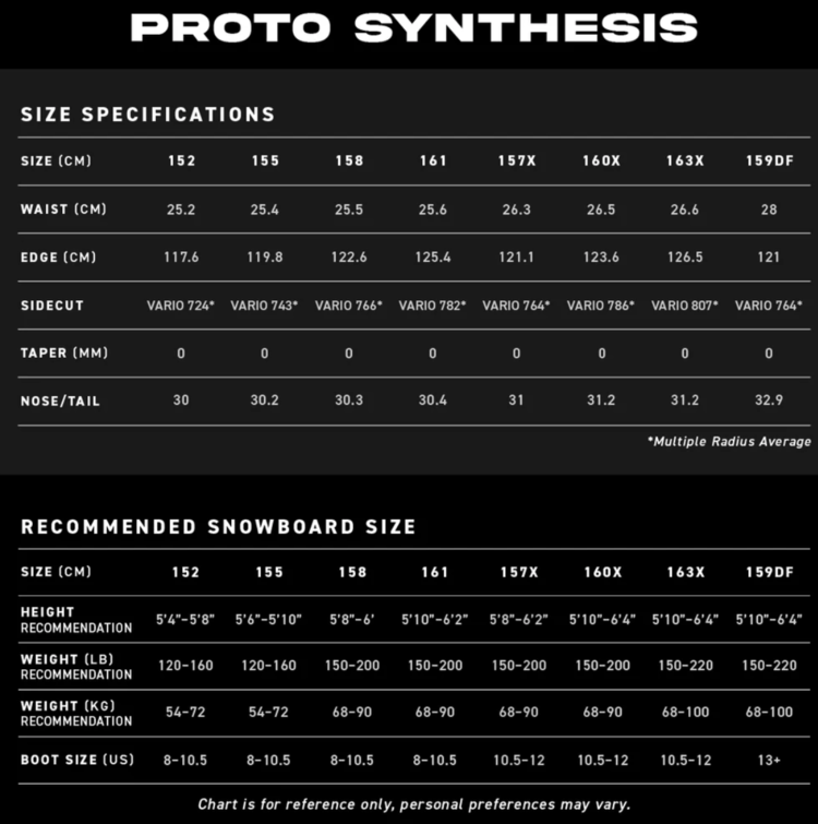 Loaded with all the technical features and the most amount of carbon of any board in our line, the Proto Synthesis is the top selling board year after year for a reason. The mid-flex all mountain freestyle true twin is perfectly balanced for spins, riding switch and stomping the biggest tricks. Rocker Camber and Carbon Max configuration allow for pop, boost in and out of turns, and vice like edge hold while maintaining natural float and pressability. Perfect for riding anywhere on the hill, the Proto Synthesis makes for a smooth ride with minimal chatter, while staying crisp and powerful.