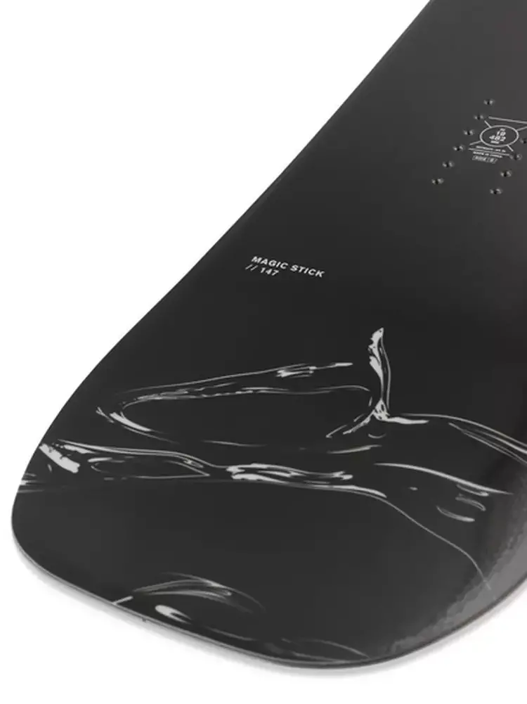 The Magic Stick is designed for all-mountain performance. The tapered directional hybrid shape will ensure float in softer snow, while providing stability on harder snow. The camber between the bindings provides snap and response and the slightly longer nose has more rocker than the narrower tail, which both provide float and control in all conditions. A Tapered Bi-Radial sidecut provides effortless turn initiation and a smooth and stable turn/exit. Slimewalls® provide a smooth ride and increase durability underfoot. Carbon Array 3™ provides extra pop and control without adding stiffness. The Magic Stick is a mid-flexing all-mountain shape for the most demanding women riders.