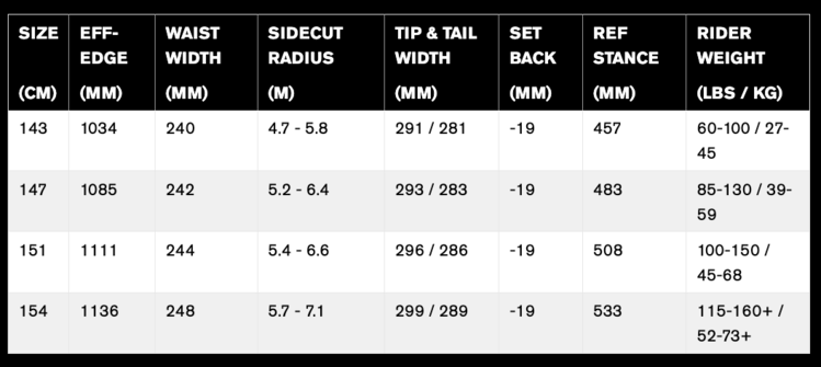 A twin sidecut which allows for the underfoot width of a wide board in the tip/tail width of a standard size. This design provides improved leverage on landings, grip through turns, and stability on flat base.
