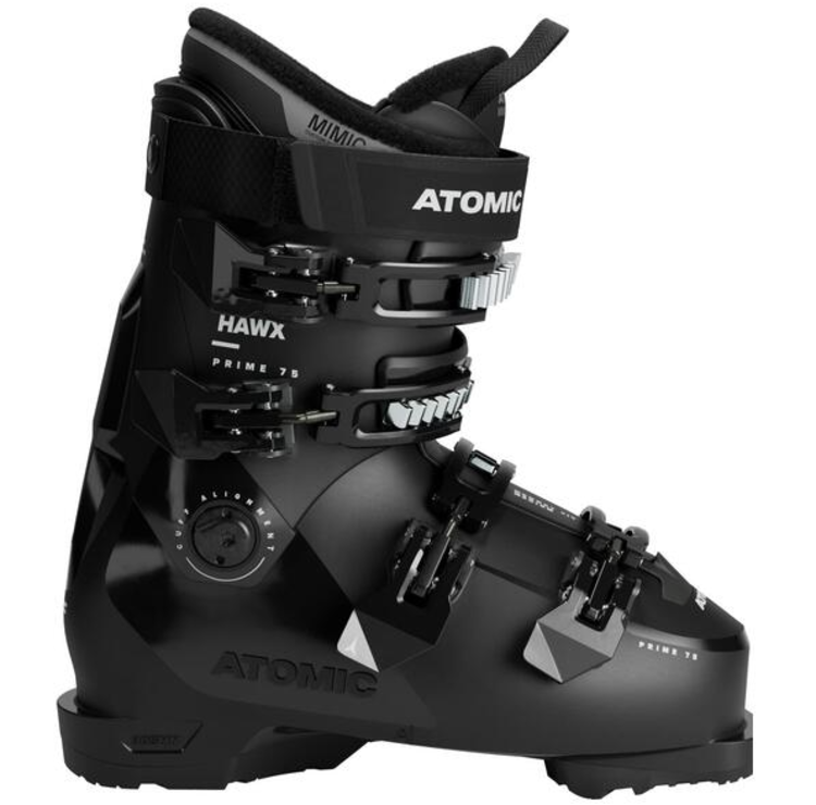 For all-mountain skiers with medium-width feet, the Atomic Hawx Prime 75 W comes with a versatile, mid-volume 100mm last and a soft, forgiving 75 flex. Engineered with Prolite, Atomic’s revolutionary construction with strategic reinforcements in key zones, this alpine boot provides more power and stability and less weight on your feet. Energy Link connecting the back of the boot’s shell and cuff adds noticeable responsiveness while skiing. An anatomically pre-shaped Mimic Bronze liner curves around the heel and ankle to provide ample cushioning and can be heat-molded for more contouring through the Mimic fitting process. The 3D Stretch Toe Box in the liner allows for a little extra length in the big toe area. This boot comes with an Adaptive Fit System (AFS) cuff spoiler that can be easily removed to increase the amount of tulip-shape and volume in the lower leg. The highly adaptable Atomic Hawx Prime 75 W is a great entry point into the medium volume world of women’s Hawx Prime boots.