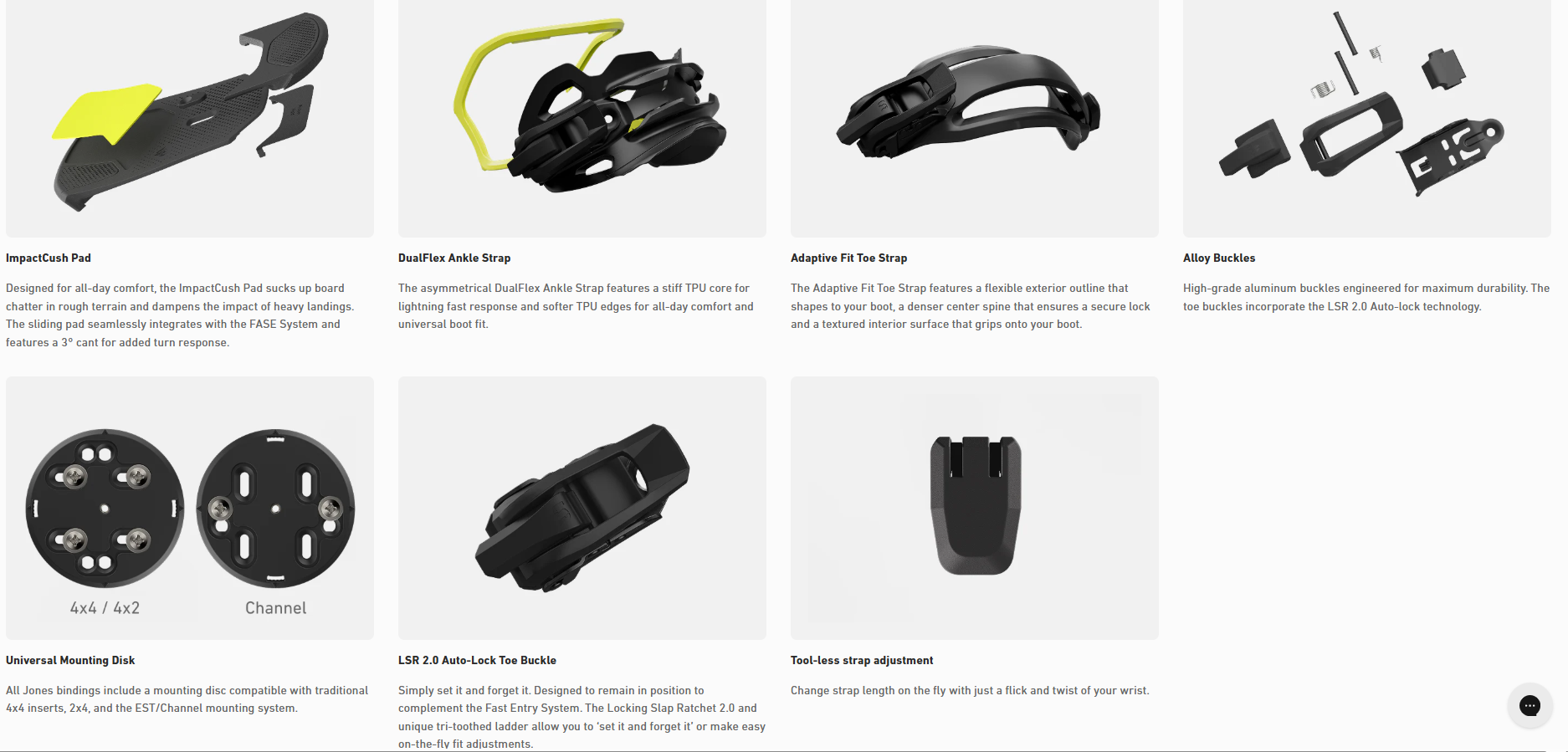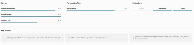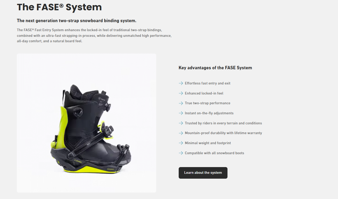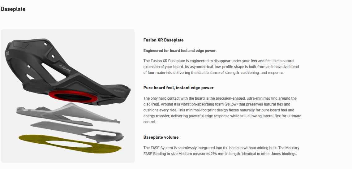 The Mercury FASE® binding is a next generation all-mountain freeride binding built for riders seeking performance and progression. It enhances the locked-in feel of a traditional two-strap binding while delivering all-day comfort and precise response, now featuring the FASE® Fast Entry System for faster entry and exit without compromise. Fully compatible with all snowboard boots, the Mercury FASE is built to perform in every condition and terrain. Seamlessly designed to integrate the FASE System, the size Medium weighs just 895 g (31.6 oz) per binding and has the same weight and volume as other Jones models.