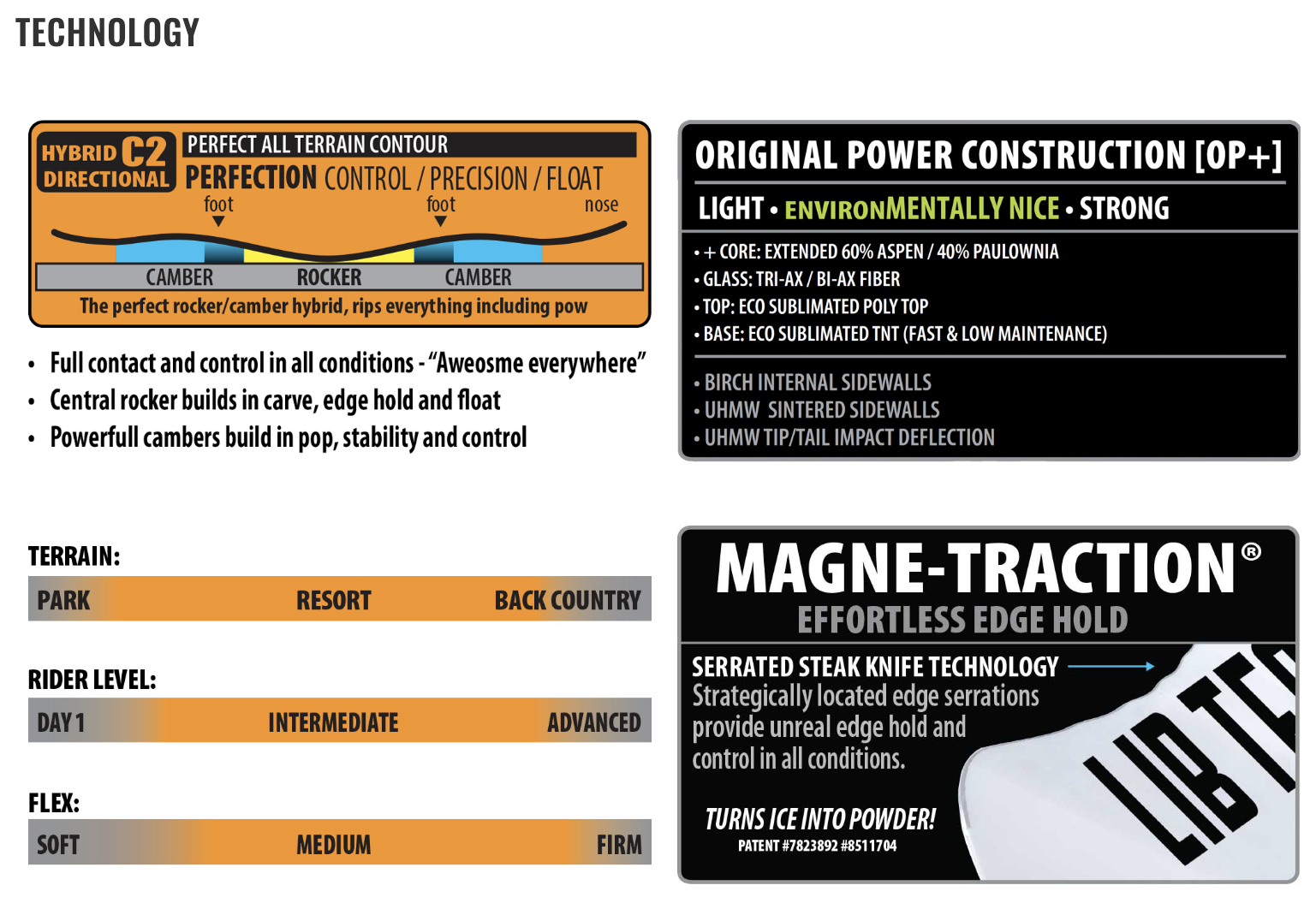A directional all terrain freeride focused but freestyle ready design that includes a floaty directional nose that reduces fatigue and maximizes fun in pow and crud. Near mid-wide widths and Magne-Traction® serrated edge tech for incredible hold, toe drag free carving and improved float. Built with a long lasting FSC certified eco core and low maintenance eco sublimated base this board is absolutely brewed to perfection.