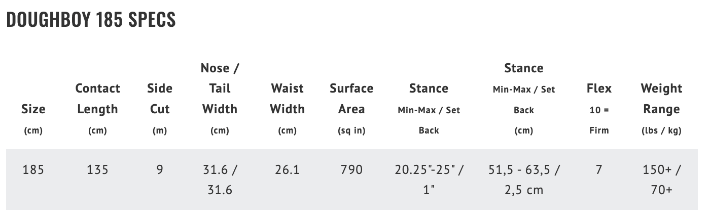 The Doughboy was created in the late 80s by Mike Olson when snowboarding was still rapidly evolving, and no one knew where we were headed except Jamie Lynn. Mike’s concept was a longer camber board on a fixed width stance would provide a smoother ride through rough terrain, float incredibly in powder and the big tips and tails would carve into beautiful arcs on hardpack and ice... he was right! This thing looks a bit intimidating, but it rides like a magical freestyle dream from an alternative universe... the inside of Mike’s mind... our friend Chauncy launches progressive spin missions of this platform on the daily. All the good stuff is built in... eco sublimated TNT fast & Low maintenance base, Aspen Paulownia core, rugged UHMW sidewalls and tip and tail and our new light, strong, Magesium Techno fiber band glass and carbon reinforcement keep this boy poppin.