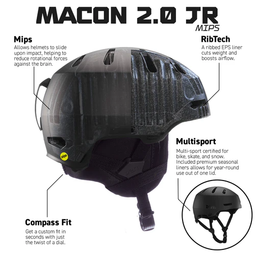 This multisport bike, skate, skiing and snowboarding helmet is 15% lighter than the previous Macon, has 12 vents to keep you cool, and comes with MIPS Brain Protection System. You can swap out our seasonal pad sets to go from summer to winter (Included) The Macon 2.0 JR is also compatible with our asteroid light so you can Stay Seen and Stay Out There, longer.