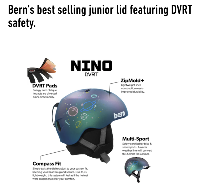 Big features in a pint sized package. The Nino DVRT features our compass fit dial fit system, DVRT protection padding, and an ultra-lightweight design ensuring maximum comfort and a perfect fit for children ages 5-8. Premium construction, a perfect fit, and adaptability for all seasons.