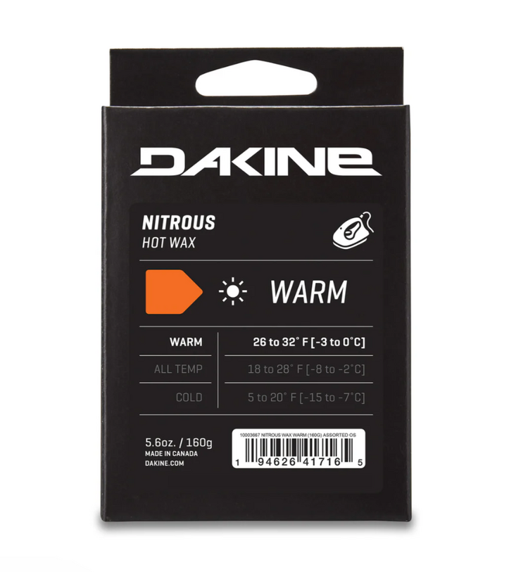 Our Nitrous Warm Wax is a quality blend of paraffin designed to improve ski and snowboard speed, and formulated to perform especially in warm weather conditions. Optimally designed for use as a hot wax, with an iron, we also made sure it would work as a rub on. Because let's face it, sometimes you don't have time to use an iron. And other times you just don't have an iron.