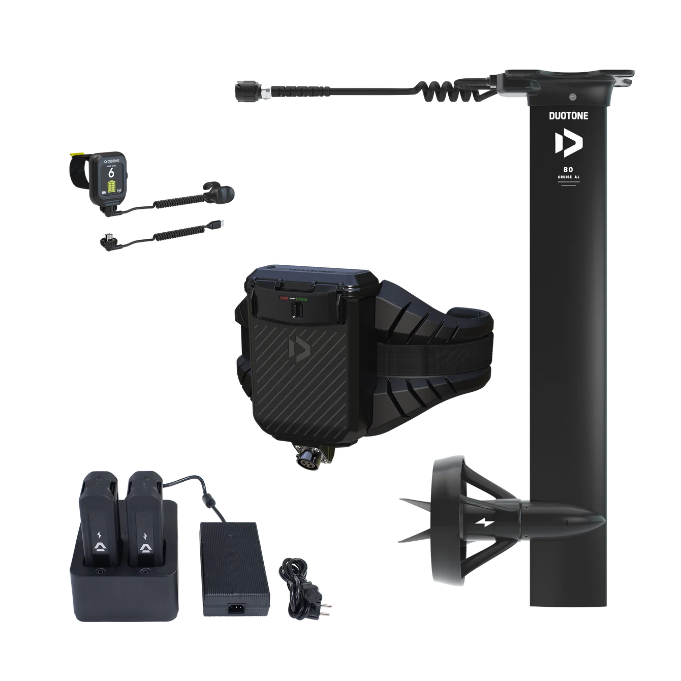 The Foil Assist is powered by two compact batteries housed in a waterproof box mounted on a lightweight eHarness (approx. 3.76 kg). This keeps your board free from extra weight and drag. With the batteries placed on your hips, the natural, fluid feel of foiling is preserved while still giving you full freedom of movement. The eHarness is buoyant and easy to remove. A cable runs neatly along the shorter board leash and connects the batteries to the eMast. The receiver integrated into the battery box ensures a stable and reliable connection between the remote and the motor throughout your entire session.