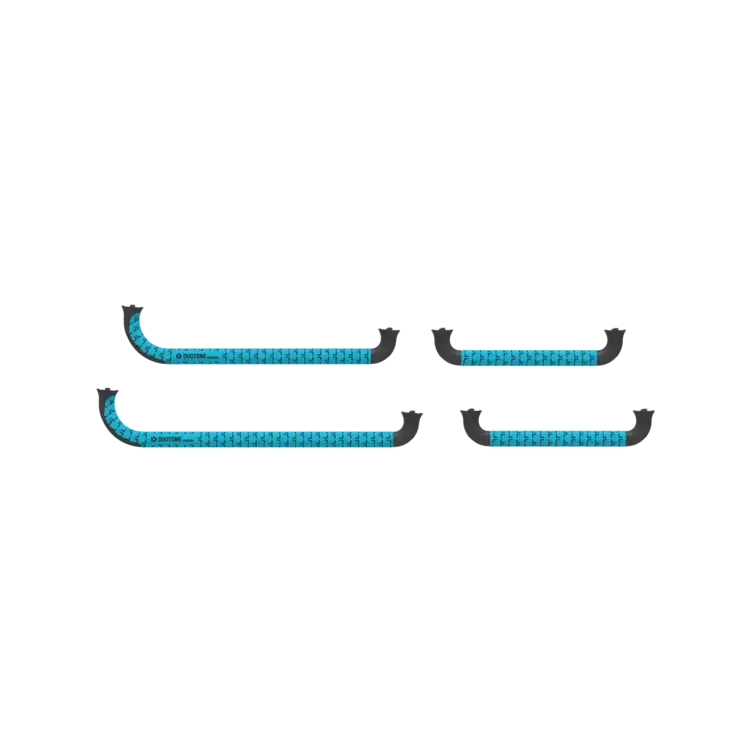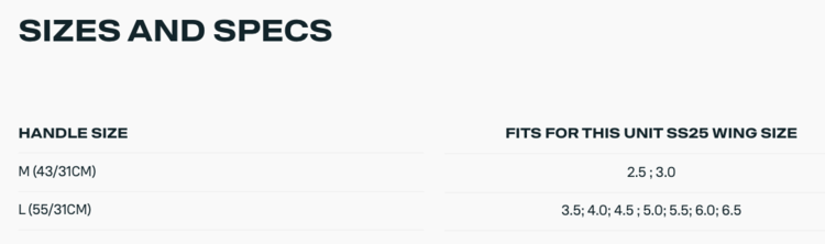 The front handle comes in two sizes: Size M (43 cm) for wings from 2.5 to 3.0, and Size L (55 cm) for wings from 3.5 to 6.5. The rear handle (31 cm) fits all wing sizes.