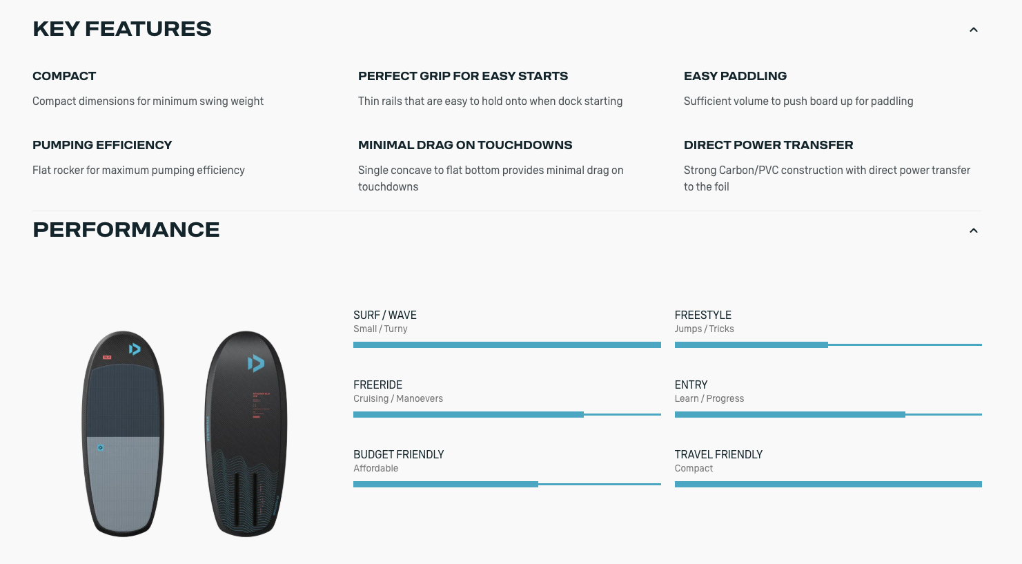 The rails are comfortable to hold and the durable full 3K Carbon construction with solid high-density core makes the board stiff and responsive.