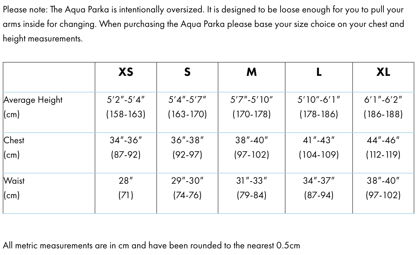 The Aqua Parka is intentionally oversized. It is designed to be loose enough for you to pull your arms inside for changing.