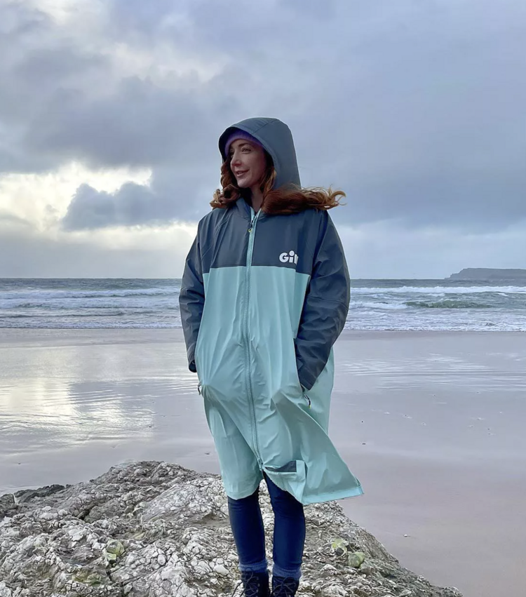 The Aqua Parka is intentionally oversized. It is designed to be loose enough for you to pull your arms inside for changing.