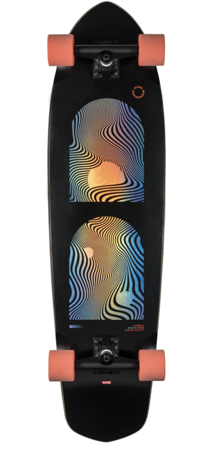 Longer length diamond tail cruiser with built-in bottle opener and soft conical wheels. The Blazer XL in Black/Orange is a 36" bigger-size cruiserboard with mellow concave. The deck is constructed from Resin 7 hard rock maple and features colourful, prism foil based art. This large-size cruiserboard also features 6.0” Tensor alloy trucks with grade-8 kingpins and high-rebound urethane bushings. Globe's 62mm 78a high-rebound urethane conical cruiser wheels are sticky enough to hold turns and slide while allowing for a smooth and stable ride.