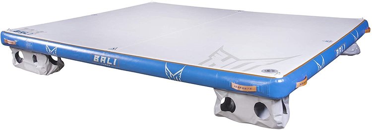 The Bali is 10' x 8' and 6" thick. The Bali's dropstitch construction is so rigid and durable you wouldn't know it's inflatable unless you saw it being inflated. The secret to the Bali's stability is the ballast bags which are located under the 4 corners of the Bali. Once submerged, these ballast bags fill up with water and work amazingly well to keep the Bali from shifting side to side and from tipping. The Bali comes with its own electric pump which makes inflation a breeze. Simply plug the electric pump into your cigarette lighter or use the alligator clips (included) to attach to your boat/car battery, turn the dial to the desired PSI and push start. The electric pump will fill the Bali while you are getting the rest of your gear ready for your day on the water. Use it to lay out in the sun, let the kids play king of the hill, use it as a mobile dock to store your gear, use it as a starting platform, attach the iSHADE tent (sold separately) to get some relief from the sun's UV rays, or simply set up a lawn chair & a cooler and cast your line in the water. The options are endless. The Bali is made of the highest quality materials and is extremely durable. It's covered against any defects for a period of 1 year, but the Bali will surely last for many years as long as it's cared for.