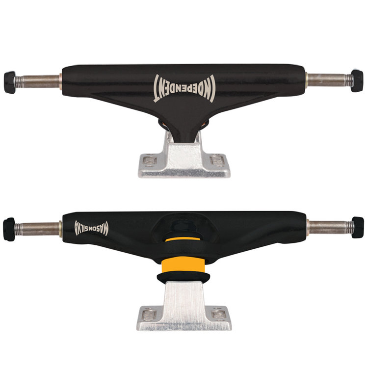 Independent Trucks Mason Silva Pro with laser engraved flat black hanger and silver baseplate. Durable all purpose truck for any type of skateboarding. 55mm tall 356 Aluminum Hanger & Baseplate Solid 4140 Chromoly Steel Axle Grade 8 Kingpin