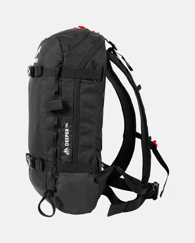 The Deeper 19L pack is a sleek sidecountry and tour pack that's the perfect size for the bare essentials - avy tools, water, snacks and a layer.​ ​The pack's compact profile is designed to keep your center of gravity tight on the way down and your board locked to your back when you hit the bootpack.