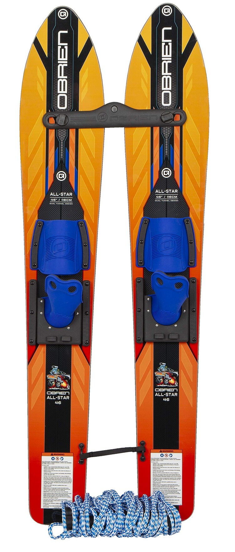 The All-Star Trainers are the ultimate training tool for teaching kids to ski! Featuring a dual tunnel design for a smooth ride, a stabilizer bar that prevents the skis from splitting apart, and the trainer rope and handle, the All-Stars have everything you need to simplify the learning process and turn your kids into waterskiers!