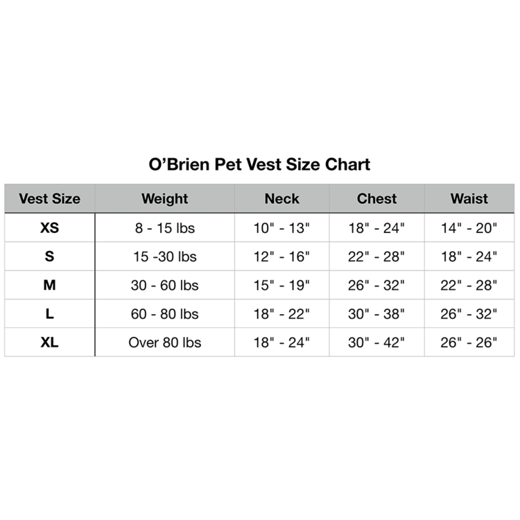 Does your dog love being on the water as much as you do? Keep them safe with the O'Brien Pet Vest. Designed for dogs of all shapes and sizes, this vest features one neck buckle and two adjustable ladder locks to fit securely around your furry friend while they are playing in the water. This vest also includes a strong nylon handle on the back to make for easy water retrieval. Check out the size chart to see which Pet Vest will suit your dog's needs.