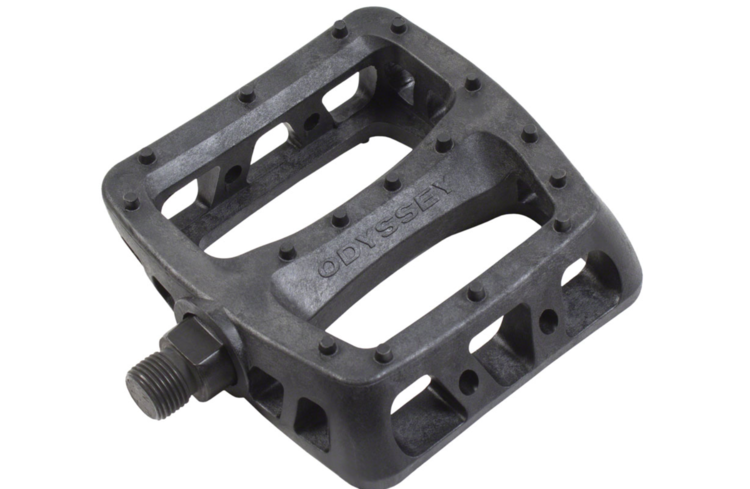 Odyssey Twisted PC pedals-extremely simple, lightweight, inexpensive and famously durable plastic-bodied design.Often duplicated but never replicated.