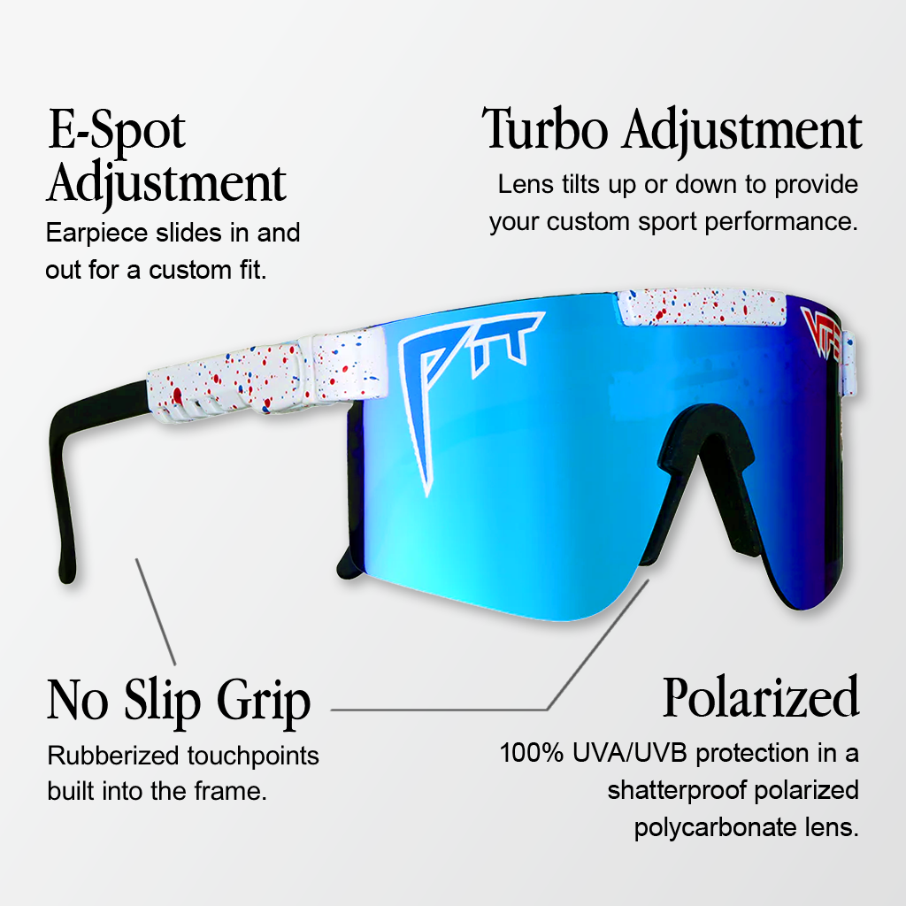 Adjustable, military designed sunglasses with a 90's flair. Strong enough to be shot at, sat on, shoved in pockets, run over and still maintain their sun and wind bucking ability. Breakthrough E-Spot™ and Turbo Adjustment™ technology guarantee a perfect fit. Demand respect and authority in The Original, the Pit Vipers that started it all.