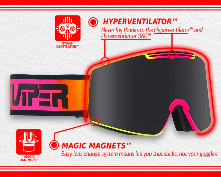 Meet the Proform Goggle, the biggest, clearest, most innovativist goggle on the mountain. Magic Magnets™ make for fast, easy lens swaps, while the Hyperventilator™ ensures maximum airflow for a fog-free view, so you’re ready for any condition.