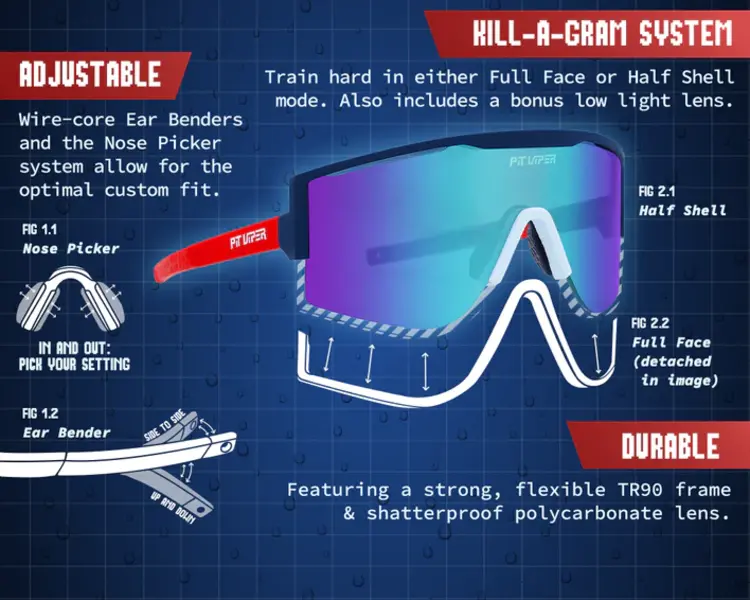 Take training too seriously in The Try-Hard. The first Pit Viper sunglasses to feature interchangeable lenses. One up the competition. Sweat out of your face. Have less fun. Train like everyone's watching.